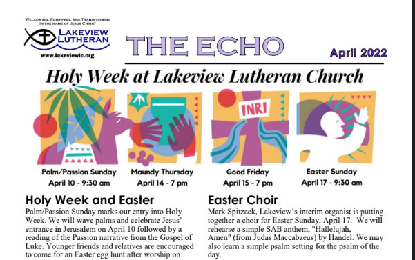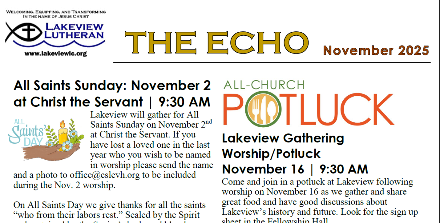 Be sure to check out this month’s ECHO. We have a lot going on at Lakeview and Christ the servant. Starting with All Saints’ Sunday, a movie night, potluck and Thanksgiving Eve Worship and Pie Fest.