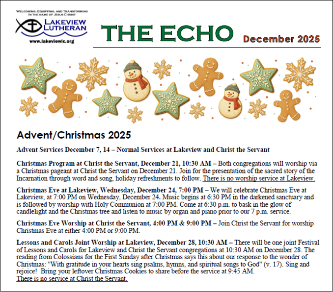 Check out the December worship schedule on the front page of this month’s ECHO.